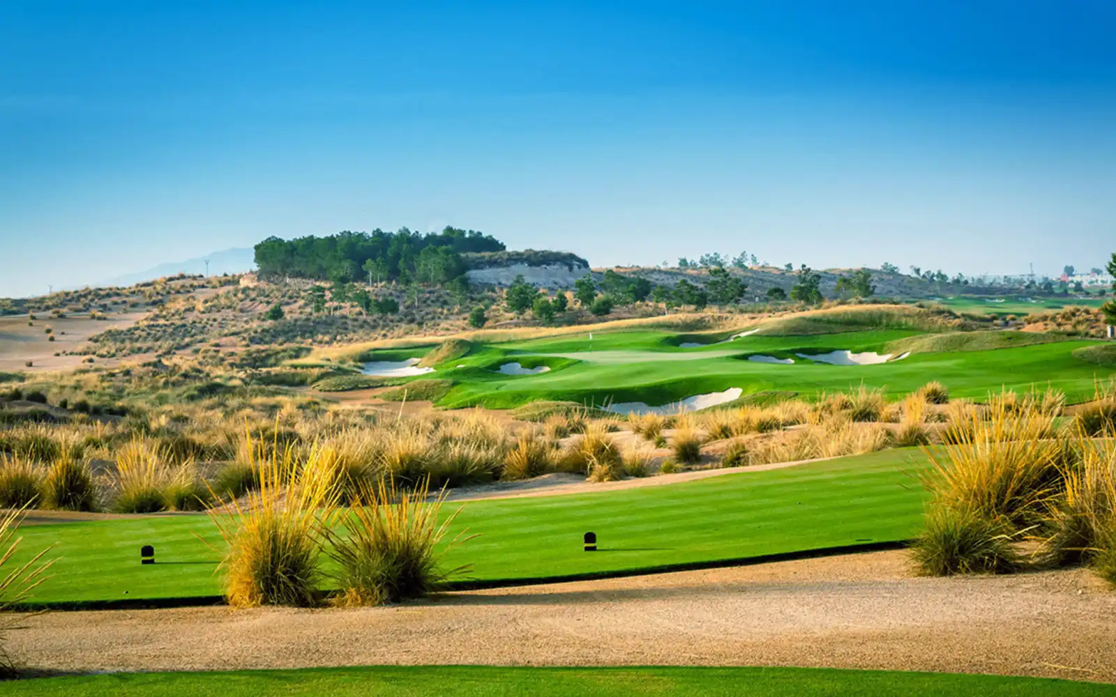 Alhama Signature Golf is an exceptional course that has been designed and signed in person by Jack Nicklaus. This long and spectacular course has been developed among five great lakes, with original circular tees, wide fairways with rough and rapid greens, 116 bunkers of particular and varied shapes with white silica sand, a paspalum semi-rough that acts as a transition grass between the fairway and the wide rough that defines all this set, to integrate it in a landscape that maintains all the indigenous flora and fauna which is typical of the nearby Sierra de Espuña, with pines, esparto grass, rosemary, thyme among other indigenous species from this area.